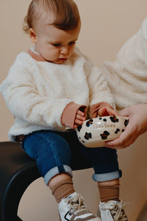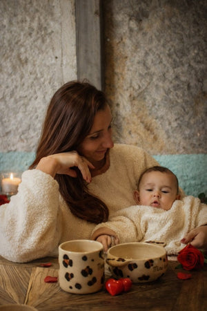 - The Mini Love Graou bowl, wheel-thrown and hand-decorated, spot by spot, for a unique and bright leopard pattern.