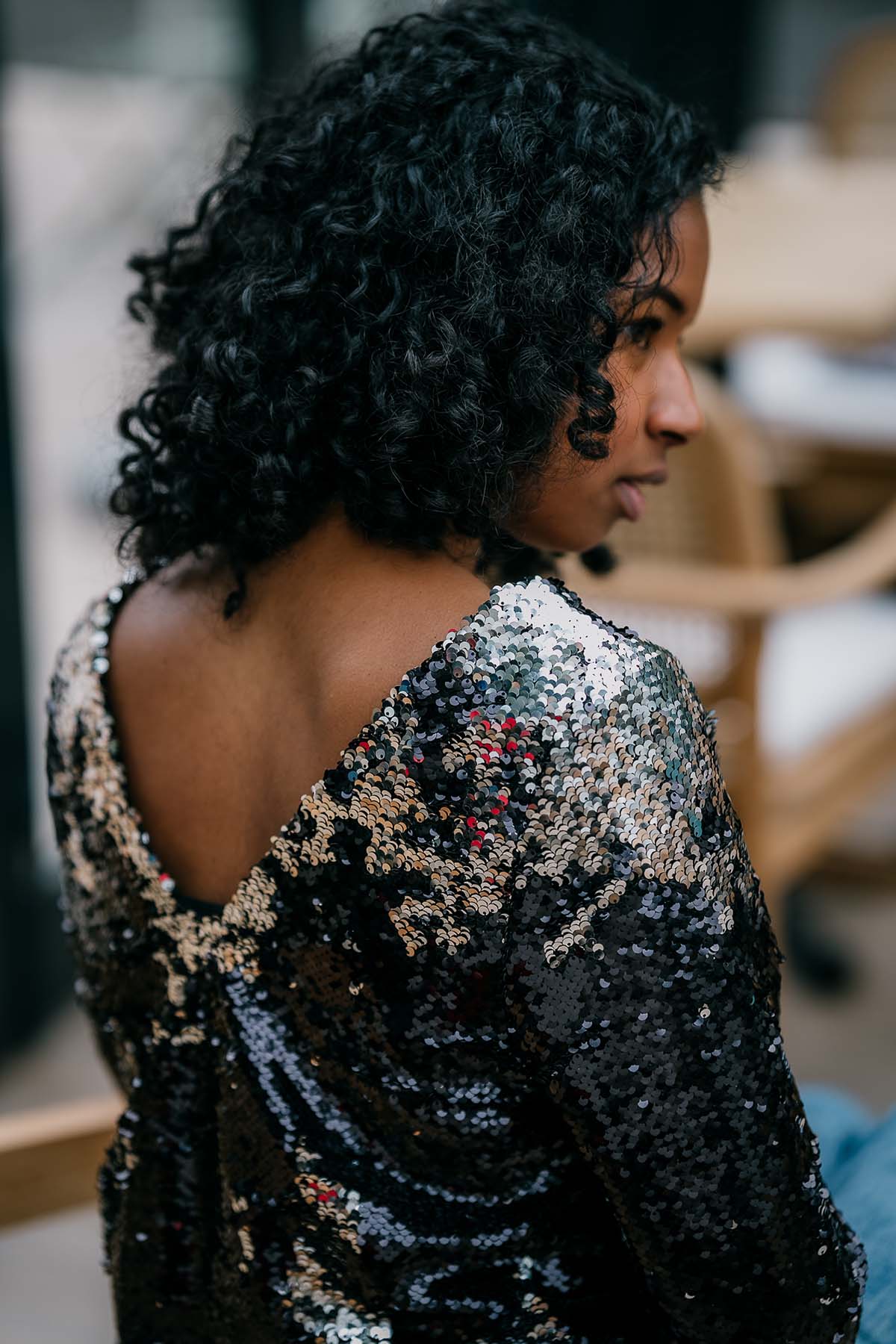 - A stunning backless design with a V-neckline to embrace your femininity and light up the dancefloor (or the living room carpet dancefloor in slippers, that works too!)