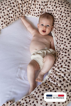 Un imprimé exclusif et moderne (vous savez, pas le léopard mémère, naaaaan surtout pas !), un côté verso en fibre de bambou naturel (votre peau nous dira merci, et vos babies aussi), et un système d’attache pour plus de facilité à placer le coussin autour de vous, pour les tétées bien installée.
